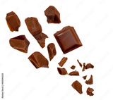 Piece of chocolate explosion isolated on white background. Levitating dark chocolate chunks Collection. Top view. Flat lay. Pattern.