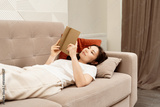 Relaxed Woman Reading Book On Sofa, Cozy Home Interior, Leisure Time, Comfortable Living Room Scene