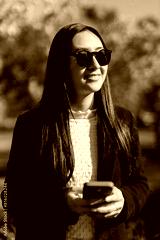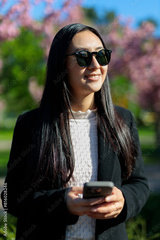 A happy Japanese woman utilizes technology in the city, managing business with her smartphone outdoors.