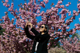 A Japanese woman captures springtime with her smartphone, taking a selfie amidst blooming sakura blossoms.
