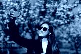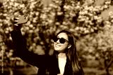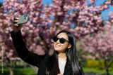 A Japanese woman takes a selfie amidst blooming sakura in the park, radiating happiness and beauty.