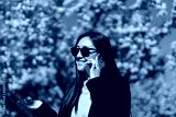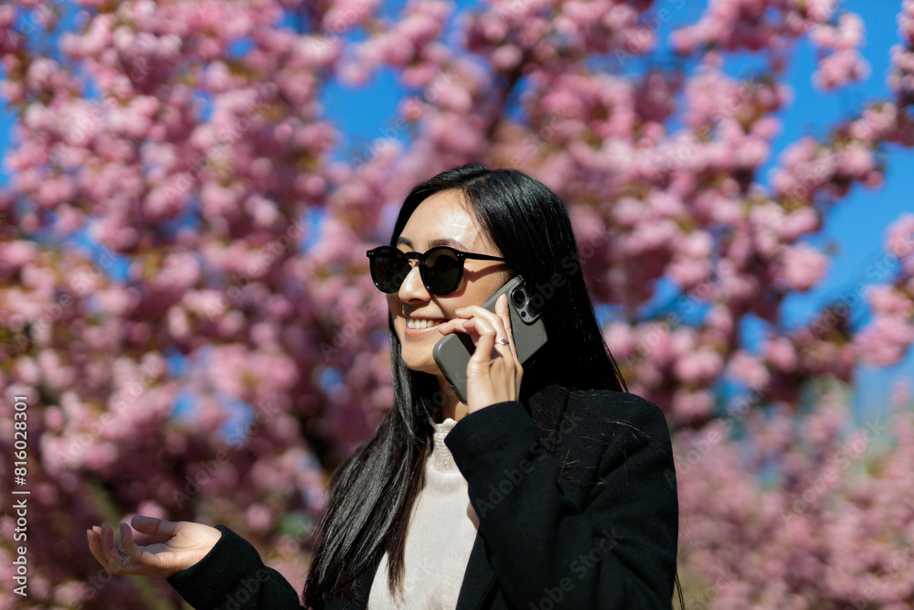 A Japanese woman walks and talks on her mobile phone amidst blooming sakura, portraying business and beauty.