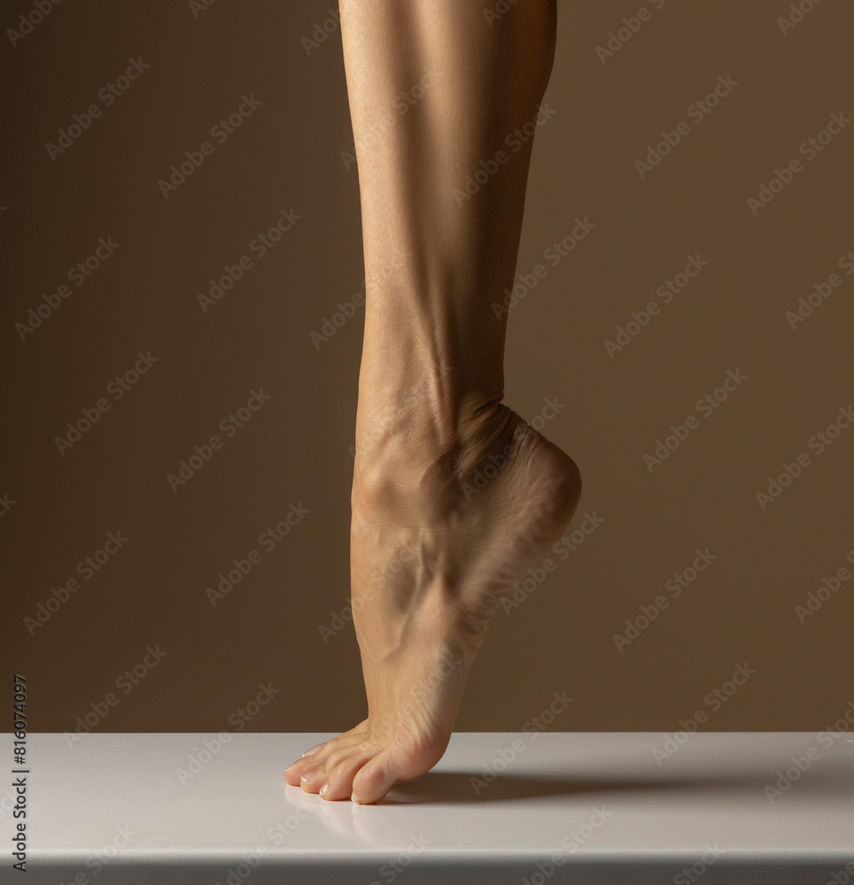 closeup, side view of female foot posing on beige background