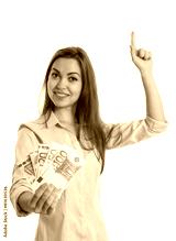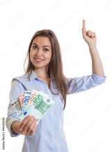 Frau mit braunen Haaren und Geld zeigt nach oben