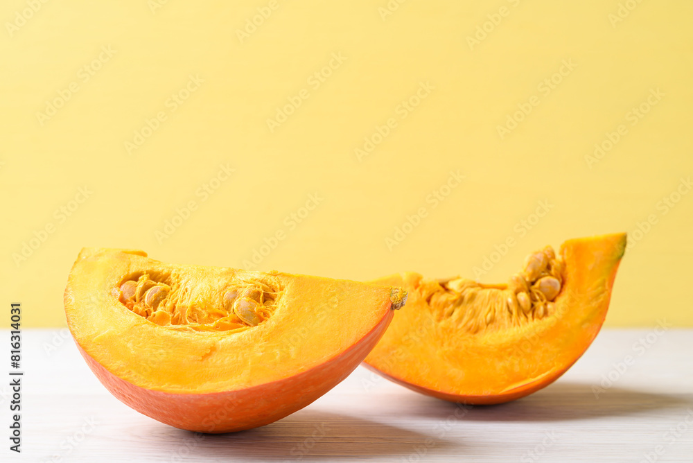 Orange Hokkaido pumpkin on white with yellow background, Autumn vegetables