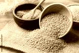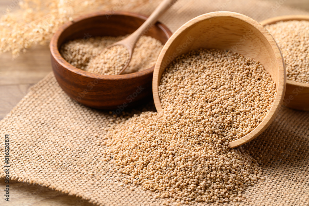 Brown quinoa seed in wooden bowl, Healthy food ingredient