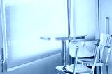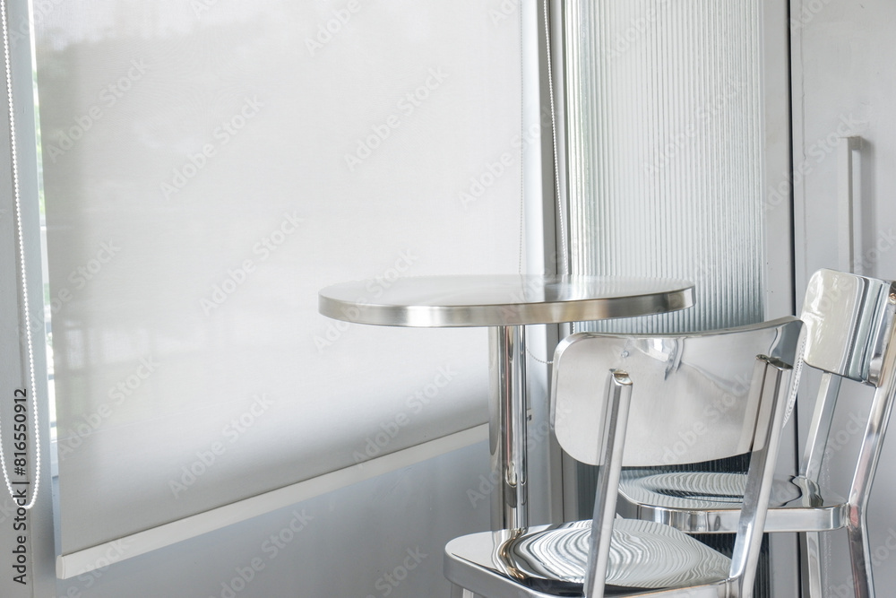 Aluminum chair and table in restaurant,Contemporary interior design of light spacious dinning room,modern furniture in living room or office,copy space.