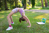 Gymnastic backbend. Teenage girl doing yoga in the park online.