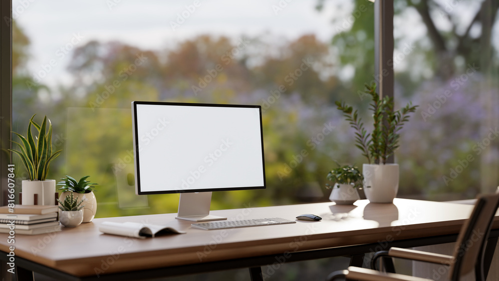 A computer mockup on a wooden desk against the large glass window with a nature view.
