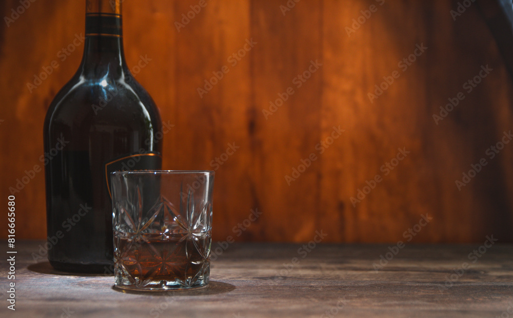 A faceted glass and a bottle of strong alcohol against a background of oak barrels in a bar on the table. Close-up. Copy space
