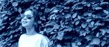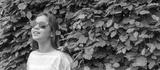 Girl wearing red sunglasses and a yellow shirt is standing in front of a green hedge. Banner