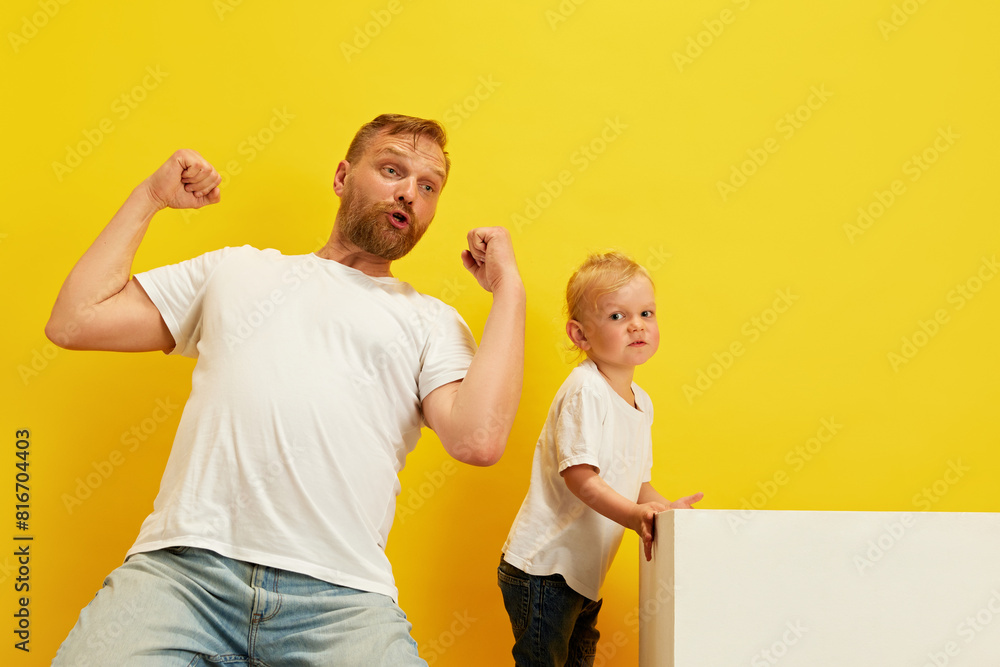Excited father-son playtime. Father and his young son in middle of exciting game against yellow studio background. Concept of Happy Father's day, family holidays celebration, parenthood. Ad