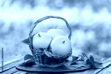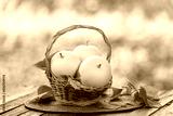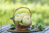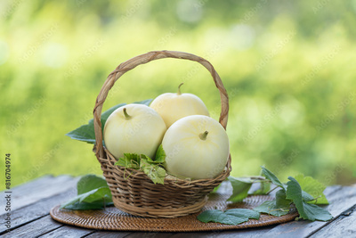 White Musk Melon on blurred greenery background, Chinese melon fruit in Bamboo mat on wooden table in garden.
