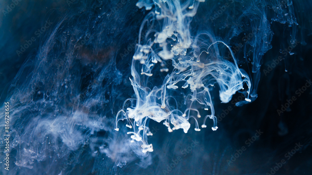 white Ink dropped into the water and photographed while in motion. Paint swirling in water.