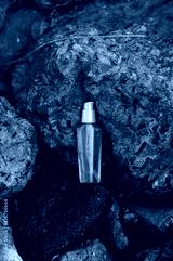 A bottle with organic body oil on the rocks on a sea shore