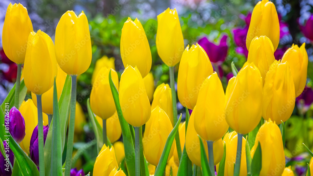A field of colorful fresh full bloom tulip flower