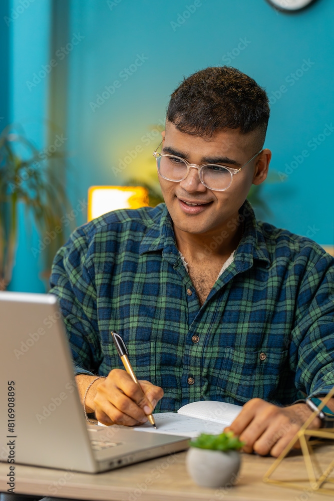 Hindu man student freelancer study with notebook write notes making conference video call talking to webcam on laptop computer. Online teacher e-learning in remote chat. Distance education online