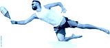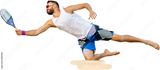 Dynamic image of young man playing beach, paddle tennis, hitting ball with racket and falling down isolated on transparent background. Concept of sport, leisure time, active lifestyle, hobby, ad
