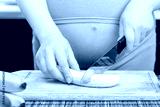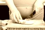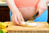 Pregnant woman prepares banana in kitchen
