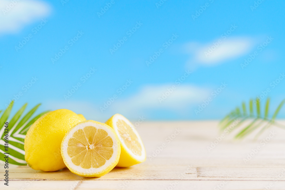 青空にレモンとヤシの葉のシンプルな夏イメージの背景