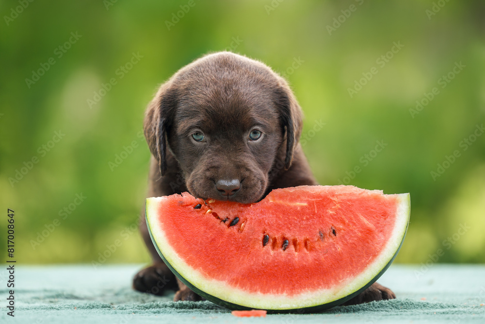 cute chocolate labrador puppy eating watermelon outdoors in summer
