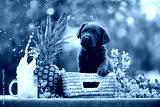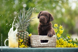 chocolate labrador puppy posing with pineapple juice splashing in the glass outdoors in summer