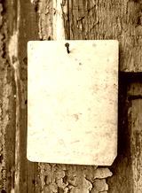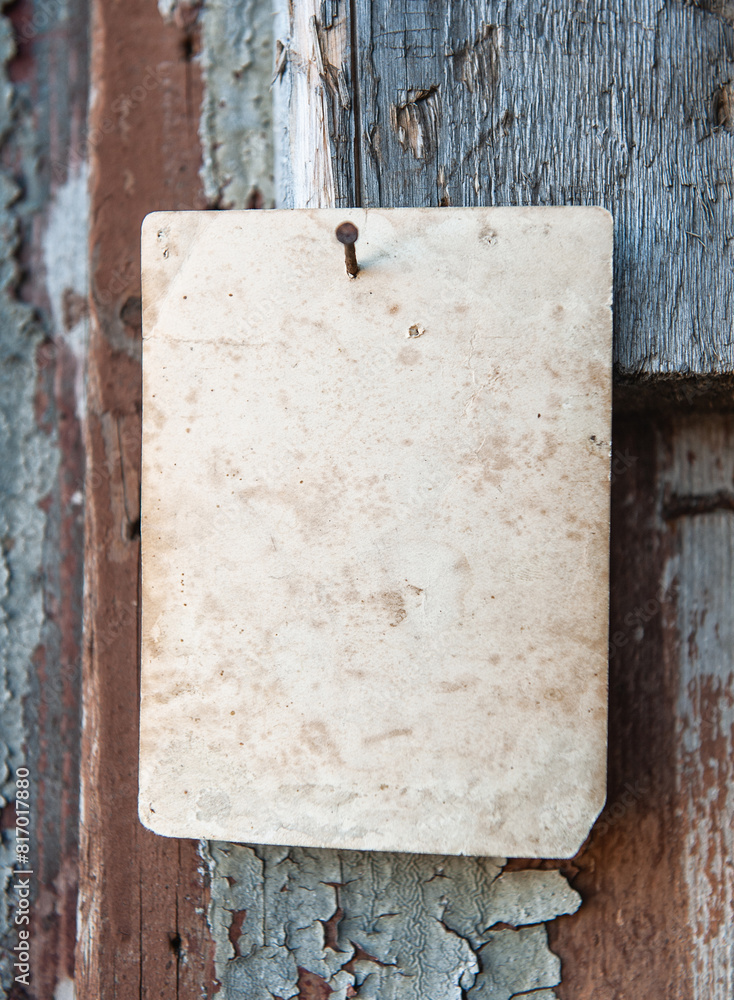 Old vintage paper advertisement hanging on aged wall nailed by doornail