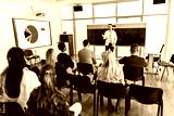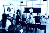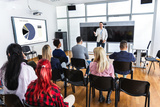 Male CEO standing in front of a multiracial group of colleagues. Multimedia classroom with smart board and graphics on them.