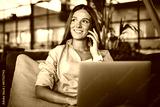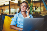 Cheerful millennial female student 20s searching information on laptop device during friendly smartphone conversation, happy successful woman received positive news via telephone call indoors