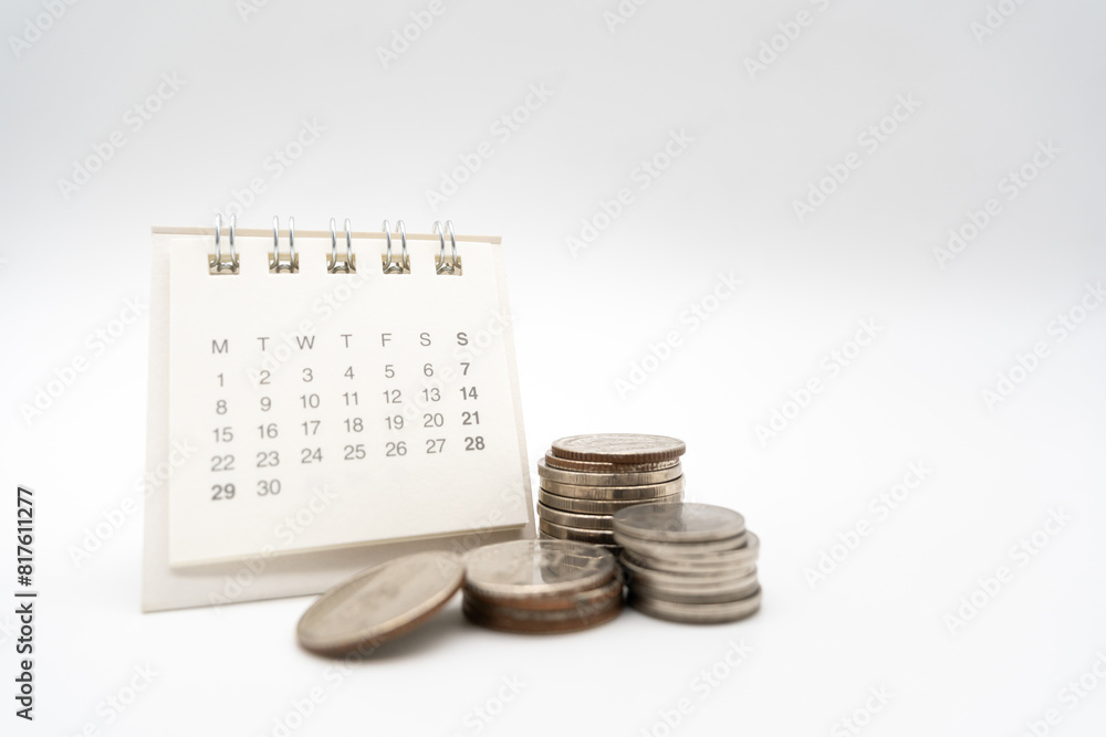 For payday loan concept. Desk calendar and blurred stack of coins in isolated background. Business, finance, savings money, wages, payroll or accounting concept