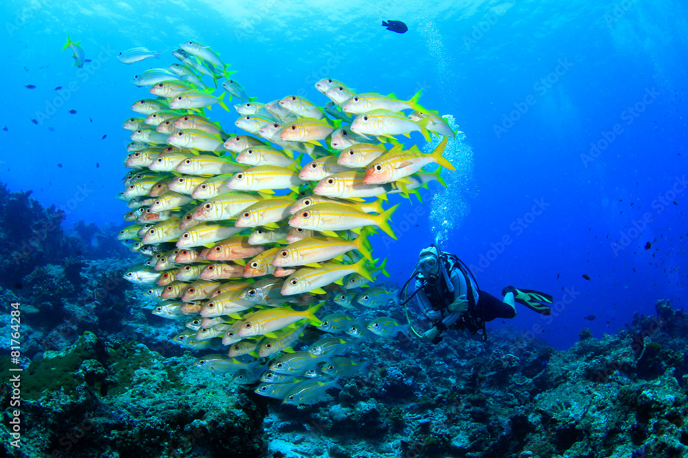Scuba diving with fish: Snappers and goatfish