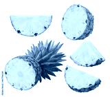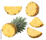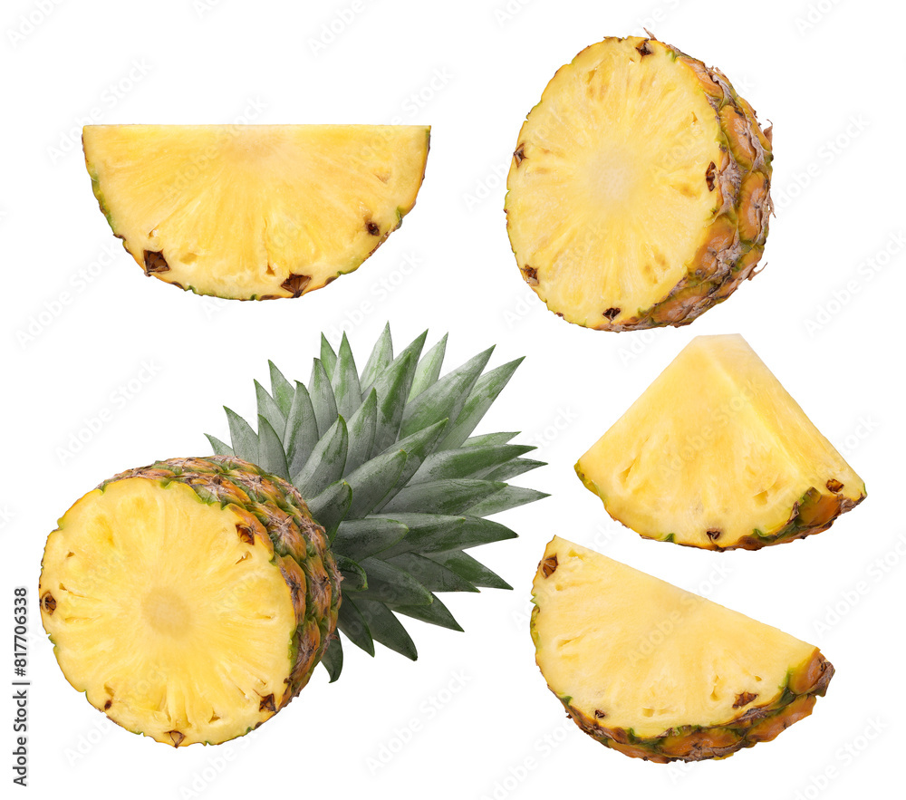 half pineapple with leaves and slices isolated, transparent png, PNG format, cut out.