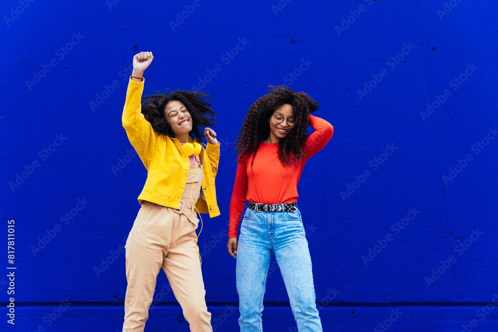 Young happy women having fun outdoor. Teenagers listening to music with smartphone and headphones in a yellow and blue modern urban area