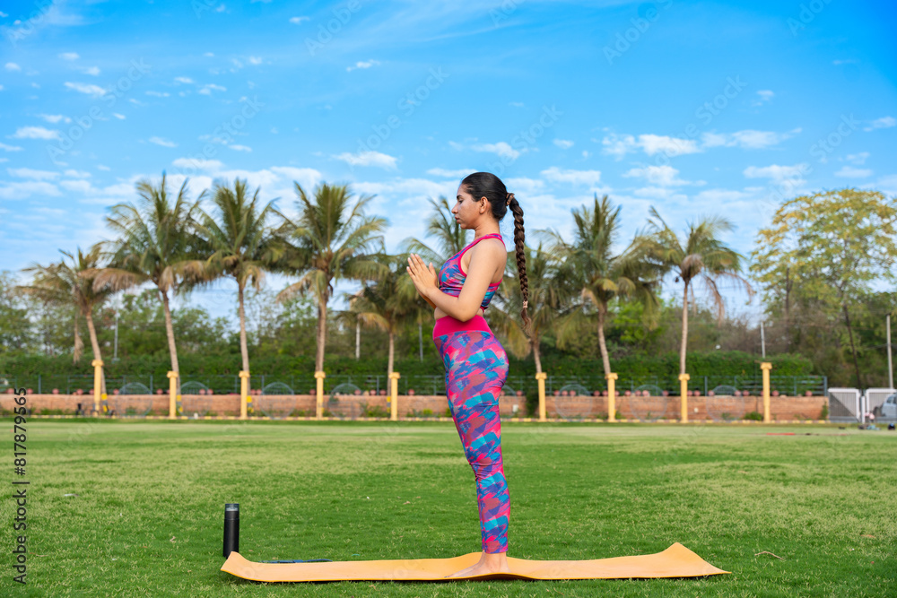 Young fit indian girl doing namaskar yoga pose in her garden. exercise, meditation, lifestyle, mental health, yoga day concept.