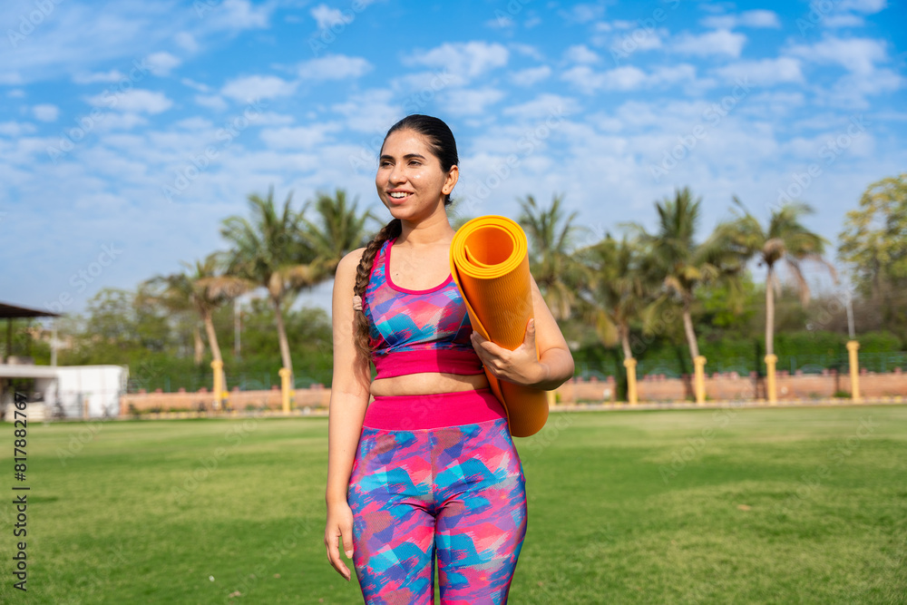Fit young indian woman holding yoga mat in garden smiling. exercise, meditation, workout, outdoor, mental health, well being.