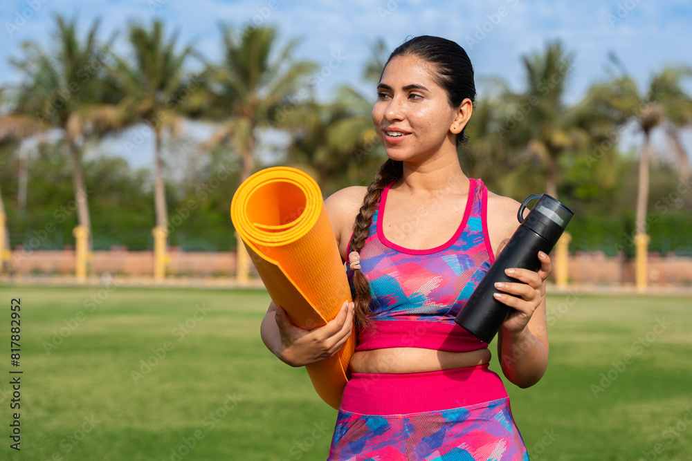young indian fitness woman with yoga mat, bottle & shaker. exercise, meditation, workout, outdoor, mental health.