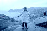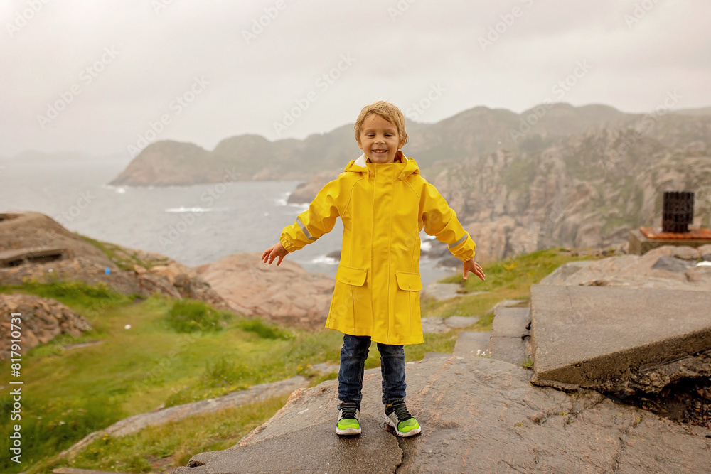 Family visiting the Lindesnes Fyr Lighthouse in Norway on a rainy cold day