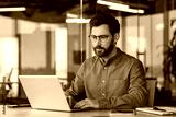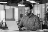 A young man in a shirt and glasses is working concentratedly in a modern office at a laptop, typing on a keyboard