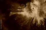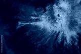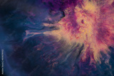 A detailed closeup of a purple and yellow painting set against a dark background, reminiscent of a sky filled with clouds and astronomical objects, creating an electric blue pattern in the art