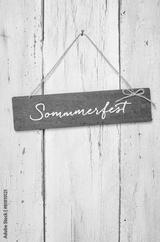 Rotes Holzschild vor weißer Holzwand - Sommerfest