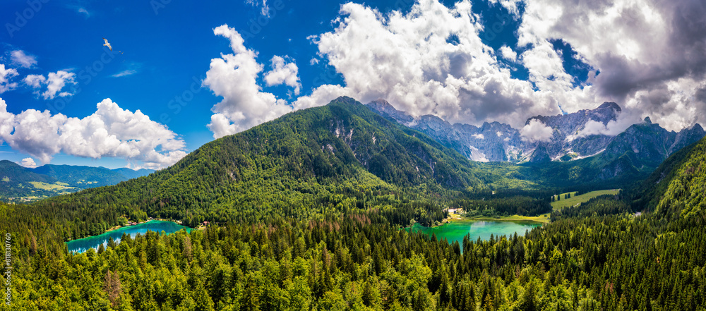Picturesque lake Lago Fusine in Italy. Fusine lake with Mangart peak on background. Popular travel destination of Julian Alps. Location: Tarvisio comune , Province of Udine, Italy, Europe.