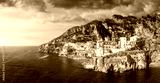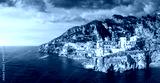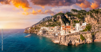 Aerial view of Atrani famous coastal village located on Amalfi Coast, Italy. Small town Atrani on Amalfi Coast in province of Salerno, Campania region, Italy. Atrani town on Amalfi coast, Italy.