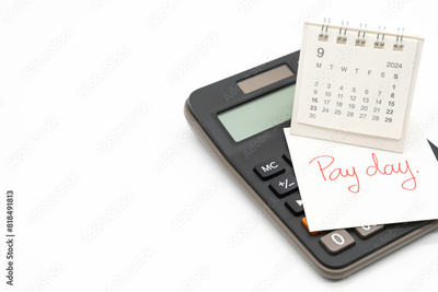 Hand writing text PAY DAY on September calendar with calculator in isolated background. Reminder concept of payment.