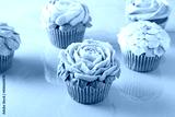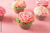 Colorful cupcakes on pink paper background. Decoration shaped like flowers with butter cream frosting.