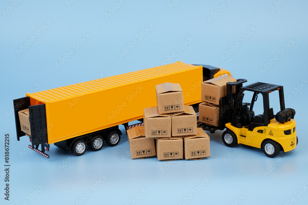 Container carrier truck and forklift truck with many carton boxes on blue background. Logistics concept.
