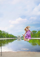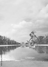 Lincoln memorial and pool in Washington DC, USA. Young girl jump high in the water poster concept.