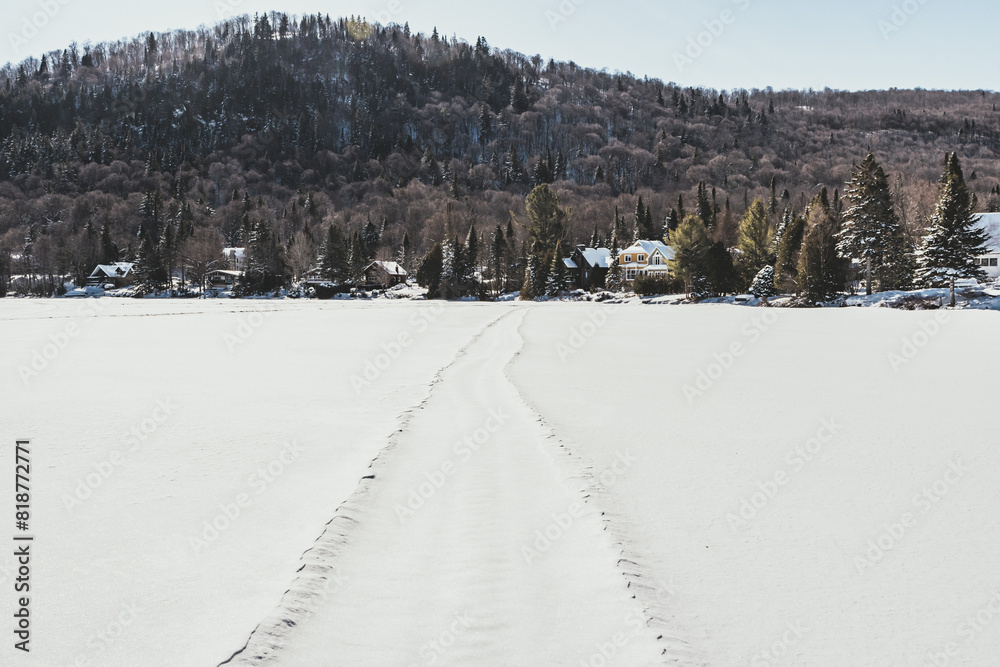 Hiking on a frozen lake in Quebec, Canada. Black Mountain Lake