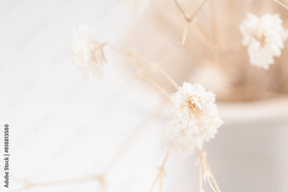 Beautiful dried beige gypsophila flowers with light blur natural background and white vase macro