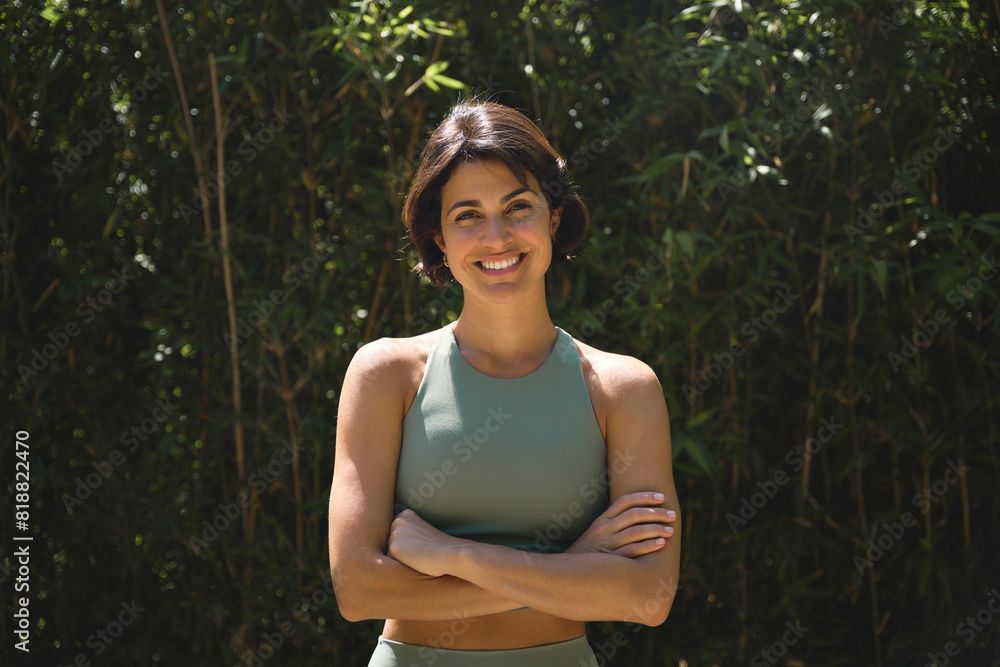 Happy fit sporty active slim confident young Hispanic woman wearing sportswear enjoying summer sunny day looking at camera standing arms crossed in green nature park. Portrait.