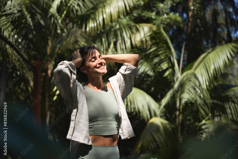 Happy relaxed young Hispanic woman enjoying summer sunny day with eyes closed feeling no stress, peace of mind, mental balance relaxing standing in green nature park among tropical trees.